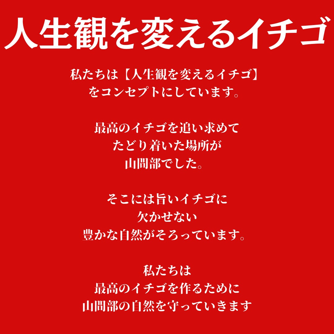 女神の雫はそんな自然豊かな山奥で育ったイチゴで「人生観を変えるイチゴ」がコンセプト。